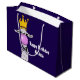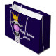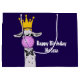 A personalized birthday gift bag (large size) with a whimsical llama blowing a big pink bubble while chewing gum. Wearing a gold crown and a black bow tie. Dark purple background.
