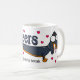 The perfect gift for the dog lover in your life this mug has a cartoon image of a sausage dog and the words "Cheers to a long coffee break" surrounded by hearts