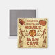 Create your own humourous, custom "man cave" fridge magnet using this easy DIY template. Made to look like the wall of a cave, the square magnet has primitive drawings of men throwing darts, a dart board, a TV, a football, two baseball bats, two baseballs, two pretzels and a couple retro beer bottles. The refrigerator magnet can be easily personalized with your name and the year your home bar or "man cave" hideout was established. The whole design is in shades of brown, yellow and a little red.