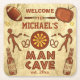 Create your own humourous, custom "man cave" pulpboard paper coaster set using this template. Made to look like the wall of a cave, the coasters have primitive drawings of men throwing darts, a dart board, a TV, a football, two baseball bats, two baseballs, two pretzels and a couple of retro beer bottles. The coasters can be easily personalized with your name and the year your home bar or "man cave" hideout was established. "Welcome" and "to" are also changeable if you'd like - but the "Man Cave" words are part of the design. The whole coaster is in shades of brown, yellow and a little red. "Customize It" to make more changes, such as resizing text. These are the ultimate, funny man cave coasters for your male sanctuary!