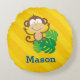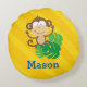 Personalized round pillow featuring a funny monkey in the jungle with a yellow stripe background. Cute and fun design for special for boys. Custom monogrammed gift. For no personalization, delete sample text and leave blank.