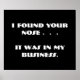 Funny Nosy People Black White Poster has the phrase "I found your nose . . . it was in my business. Nosy people in your life will now get the hint when they see this poster on your wall.