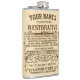 This humourous custom flask design is made to look like an old Victorian or Edwardian newspaper advertisement bottle label for a miraculous "cure all" remedy made by a quack medical doctor. The background looks mottled and slightly worn and the text reads, "[Your Name's] patented Restorative / cures headache, spasms, pain, nervous fits, hysteria, blues, typhoid, heart palpitations, seasickness, flatulence, consumption, fainting spells, black death, and leprosy / may cause blindness / best quality guaranteed / prepared at the [your name's] medical laboratory."
