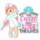 A vinyl decal with a humourous saying: First i drink the coffee, then I save the lives. Perfect for nurses. Featuring an illustration of a female nurse wearing a cute old fashioned nursing hat and carrying a giant hypodermic needle.
