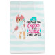 A gift bag with a humourous saying: First i drink the coffee, then I save the lives. Perfect for nurses. Featuring an illustration of a female nurse wearing a cute old fashioned nursing hat and carrying a giant hypodermic needle. Background is a light blue and white striped pattern.
