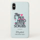 Casemate phone case with a cute and comical saying. Typography text says: This superhero wears scrubs. Designed with a light blue stethescope and a big pink heart and a pink heart monitor line. A light blue background with faded pink polka dots.