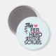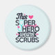 A magnet with a cute and comical saying. Typography text says: This superhero wears scrubs. Designed with a light blue stethescope and a big pink heart and a pink heart monitor line. A light blue background with faded pink polka dots.