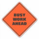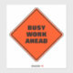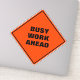 Funny classic orange diamond caution road sign warns of busy work ahead in a thick black sans serif font. A pun play on words of a classic sign, road work ahead.