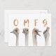 This is a watercolor painting of ostriches with transitioning emotions from calm to a meltdown. There are letters on top of each ostriches that reads “OMFG” in faux gold foil.
