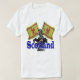 Funny patriotic Scottish dog animal character piper playing the bagpipes and wearing a kilt in traditional Scots tartan with the lion rampant flags of Scotland.