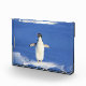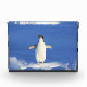 In a whimsical display of comedic flair, a penguin slides across the ice, its flippers outstretched for balance, its eyes wide with surprise and delight. Its black and white feathers glisten in the sunlight, adding to the scene's cheerful charm.