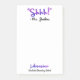 Funny Personalized Shhh! School Librarian Quote Post It Note Pad. Watercolor brushstroke purple lettering says "Shhh!" in quotes. Personalize with Librarian's name and name of school. Librarian written in pretty purple and blue watercolor styling brushstrokes. Modern and trendy gift ideas for school librarians. Be quiet library humour gift for your favourite librarian. Custom Post-it notes for Librarians.