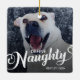 Funny dog christmas holiday ornament featuring a fully replaceable printed photo on both sides, a dusty overlay, the humourous saying 'define naughty', the pets name and the year to create an unforgettable keepsake that you can cherish forever.