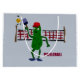 Fun primitive art style pickle holding pickleball paddle and playing pickleball with net.