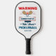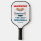 Funny Pickleball Typography Personalized Name Pickleball Paddle features the text "Warning may constantly talk about pickleball" in modern red and blue script typography with your personalized name below. Perfect gift for Pickleball sports clubs, Christmas, birthday, Mother's Day, Father's Day, best friends, sister and more. Designed by ©Evco Studio www.zazzle.com/store/evcostudio