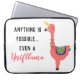 Motivational laptop case featuring a whimsical graphic illustration of a Unifllama. The Unifllama is a mythical creature that combines a flamingo, llama and unicorn. The design also features the funny motivational quote, "Anything is possible, even a Unifllama". The perfect gift for flamingo-lovers, unicorn-lovers and llama-lovers.