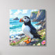 Puffin themed wall art. A beautiful vibrant colourful ai illustration of a puffing watching the ocean waves by the sea shore surrounded by rocks, dunes and flowers.