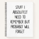 Simple lined white notebook for notes, to do lists, and more with a funny cover quote - Stuff I Absolutely Need to Remember But Probably Will Forget.