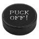 Funny hockey humour "puck off" black hockey puck with white text.