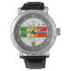 This geeky watch features the image of a radiation dosimeter dial with a scale in the range 1 - 100 microSieverts per hour (and the corresponding 1 - 10 milliREM dosage) as measures of radiation absorbed by the body, and a colour scale from green to red representing the extent of exposure hazard. Over the dial is a blue indicator that gives a reading from the scale. Change the watch style to suit. The design is a printed image on the watch face. It does not measure radioactivity nor does it emit radiation.