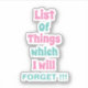 Funny Reminder for Forgetful People Don't Forget Square Sticker with a funny reminder quote - List Of Things which I will FORGET !!! Attention all forgetful folks! Time for a sticky reminder to never forget the unsung hero of labelling and organizing: the square sticker! So, next time you're trying to keep track of things or add a touch to your belongings, don't forget your trusty square stickers! They're the secret thing for the forgetful and the creatively inclined. Stick it, label it, and conquer the world, one square at a time!
