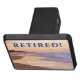 Are you retired? Then tell everyone with this beautiful sunset beach photo. Customize with any funny info you can dream up and even your photo. White and blue text.