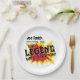 Fun retirement party plates: "[Name of retiree] can retire but the legend will live on!" Red and yellow starburst and fun comic style font. Customize the name of the retiree. Can be adapted for any kind of goodbye party.