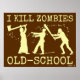 The kids today might kill zombies with guns, explosives or futuristic lasers, but where's the fun in that? Okay, that is pretty fun, but it's not as exciting as whipping out the old baseball bat and axe. This retro design is all about old-school zombie killing / hunting. It shows the silhouette of an undead man with his arms stretched out. In front of him, an old-fashioned lady wields an axe over her head. And behind him, a man who resembles Lincoln bashes a bat into his brains. The text says, "I Kill Zombies Old-School." This is a humourous design for anyone who enjoys classic zombie slaying.