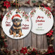 On the front of this Holiday ornament is the image of a cute Rottweiler puppy wearing a red and white Santa Claus hat. He sits with a broken tree ornament in front of him. The red text says "Dear SANTA Define NAUGHTY". On the back, red and green text says MERRY CHRISTMAS", and there are additional text fields for you to customize to whatever you'd like.