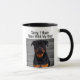 A Rottweiler themed coffee mug. A one of a kind and an original design. The design features a Rottie dog on a textured background with the text "I can't I have plans with my dog". Perfect for the working dog owner, dog trainer, service dog handler.