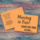 This is a simple minimalist text design with two fonts and a sassy sarcastic and funny one liner on the front that says: Moving is fun! said no one ever... on a vibrant orange background. The back says: But we made it! Please make a note of our new address, and there is a text template for you to add your new address or you can delete that part and write it in by hand. A postcard is a fun economical way to send out your moving announcement on a budget.