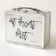 This stylish lunch box says "eat dessert first" in trendy, black script typography.