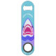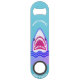 Funny cartoon drawing of a great white shark leaping from the waves with its jaws wide open.