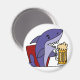 Funny shark is drinking a mug of beer while sitting in a red chair in this cool fun original art design.