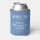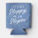 Funny ski bachelorette can coolers featuring a drawing of winter mountains, the humourous saying "let's get sloppy on the slopes", and a text template that is easy to personalize.