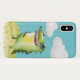 You'll love showing off your phone covered in this unique cartoon-style case featuring a whimsical smiling gator in watercolor hues of green and yellow. A bright blue sky with puffy white clouds forms the background.