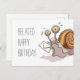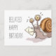 A cute snail cartoon on a belated birthday postcard. Use "Personalize this template" to tweak the "Belated Happy Birthday!" text and create a unique, customized card. A simple design featuring a funny brown snail with big eyes on stalks. The anxious snail is clutching an envelope as it arrives late in the bottom right corner.