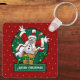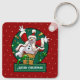 A funny snowman cartoon on a keychain or key ring for Christmas. Use "Personalize this template" to change the "Merry Christmas!" text and create a unique, customized item; text changes are reflected on both sides. It's maximum Christmas with this excited snowman dressed up as Santa Claus, jumping out of a Christmas present like a jack-in-the-box. The surprise gift is wrapped in gold paisley wrapping paper and a green ribbon with white snowflakes. An ideal stocking filler.