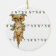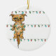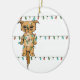 this white ceramic christmas tree decoration depicts a seemingly very unpleased cartoon kitty who seems to have gotten into christmas stringer lights, that are now strung up on display. Great addition to any holiday wardrobe