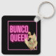 Fun keychain design for ladies who love to Bunco! Vintage dancing woman in crown photo cutout along with pink neon "Bunco Queen" text on charcoal grey background