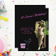 Fun & funky invite for adults features neon cocktail and "happy hour" with vintage butterfly costumed dancer and pink customizable text on black background.