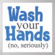 Remind friends and family members of the importance of washing their hands with this funny wash your hands bathroom hygiene sign. This design features a simple white background with a modern stylized text that reads "Wash Your Hands (no, seriously)." The text is in blue and black.