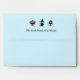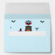 Envelope that matches a separate change of address card. Envelope shows "The Smith Family Has Moved" on the flap below a vampire, witch, and green monster. Customize the text. A haunted house full of Halloween characters, including a vampire, witch, ghost, devil, mummy, grim reaper, monster, and pumpkins displays inside the envelope. The background is light blue.