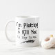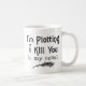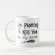 This humourous mug design for writers / authors says, "I'm Plotting to Kill You." Below that, in smaller letters, it adds, "in my novel." The design is done in a retro mystery-novel-type font and a typewriter font. There's also a quill pen with a little ink dripping off it. This is a funny drink mug design for fiction writers of all kinds, and it's especially fun for mystery writers, horror writers or anyone who writes stories that involve murder plots.