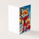 Illustration of a cheerful anthropomorphic fox sitting in the vibrant city street, now transformed for the holiday season. The fox, adorned with a playful red scarf and a tiny Santa hat, beams with joy. The urban background is dusted with soft, white snow, creating a cozy, festive atmosphere. Snowflakes gently fall around the scene, and the trees lining the sidewalk are decorated with twinkling lights and colourful ornaments. The light blue vintage car is now decked with a wreath on the front, enhancing the whimsical charm.