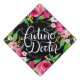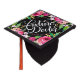 Super cute cap topper with Original calligraphy by Joy Kelley on a black background adorned with watercolor flowers. Personalize with your name and class year.