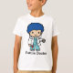 Cute boy in a doctor's white coat with a stethoscope and a reflex hammer. For the future doctor. Customize the text.