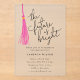 Minimal graduation party invitation featuring hand drawn illustration of a pink tassel with a hand lettered typography text that says "the future is bright."