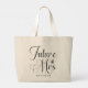 Future Mrs. Custom Name Wedding Tote Bag - Custom tote bag features modern script typography and is personalized with your future surname. Font is accented with an engagement ring. Shown in black and white.