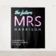 Cool modern "The Future Mrs" personalized black photo booth tapestry for your bridal shower, with "the future" and "MRS" written in teal blue and hot pink scripts with a neon lights effect. You can personalize with your future married name, first name and shower date. The bottom corner is left blank for an area for your guests to take photos.